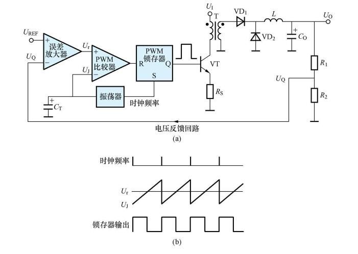 電壓控制是開關(guān)電源最常用的一種控制類型。以降壓式開關(guān)穩(wěn)壓器(即Buck變換器)為例,電壓控制型的基本原理及工作波形分別如圖1 (a)、(b)所示。其特點是首先通過對輸出電壓進行取樣(必要時還可增加取樣電阻分壓器),所得到的取樣中壓UQ就作為控制環(huán)路的輸入信號。然后對取樣電壓和基準電壓UREF進行比較,并將比較結(jié)果放大成誤差電壓Ur,再將Ur送至PWM比較器與鋸齒波電壓Uj進行比較,獲得脈沖寬度與誤差電壓成正比的調(diào)制信號。圖1 (a)中的振蕩器有兩路輸出,一路輸出為時鐘信號(方波或矩形波),另一路為鋸齒波信號, CT為振蕩電容。T為高頻變壓器,VT為功率開關(guān)管。降壓式輸出電路由整流二極管VD1、續(xù)流二極管VD2、儲能電感L和濾波電容Co組成。PWM鎖存器的R為復(fù)位端,S為置位端。