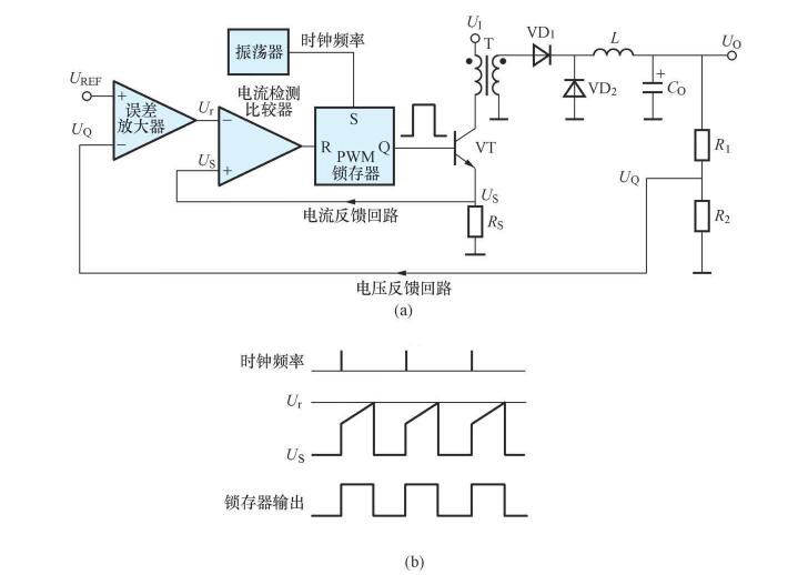 電流控制型是在電壓控制環(huán)的基礎(chǔ)上又增加了電流控制環(huán),其基本原理及工作波形分別如圖2 (a)、(b)所示。Us為電流檢測電阻的壓降,此時PWM比較器變?yōu)殡娏鳈z測比較器。電流控制型需通過檢測電阻來檢測電流,并且可逐個周期的限制電流,便于實現(xiàn)過電流保護。固定頻率的時鐘脈沖將RS鎖存器置位,從Q端輸出的驅(qū)動信號為髙電平,使功率開關(guān)管VT導(dǎo)通,髙頻變壓器一次側(cè)的電流線性地增大。當(dāng)電流檢測電阻Rs上的壓降達到并超過Ur時,電流檢測比較器翻轉(zhuǎn),輸出的高電平將鎖存器復(fù)位,從Q端輸出的驅(qū)動信號變?yōu)榈碗娖?,令幵關(guān)管關(guān)斷,直到下一個時鐘脈沖使RS鎖存器置位。