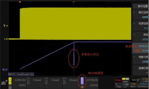 這個時候用ZDS4000系列示波器新開發(fā)獨(dú)特的占空比趨勢測量功能,將每一個PWM波的占空比顯示在屏幕上,點(diǎn)擊示波器數(shù)學(xué)運(yùn)算Math按鍵,模式選擇趨勢圖,類型選擇占空比,示波器會自動檢測PWM波的周期和閾值,無需過多設(shè)置,就可以快速出波形,波形如圖5所示。屏幕上除了通道1,還多了MATH通道,顏色為紫色,MATH通道顯示的即是占空比趨勢,可以看到占空比緩慢遞增后大約在屏幕中間位置出現(xiàn)了異常。和通道1一樣,MATH通道也可以調(diào)節(jié)垂直檔位和偏移。
