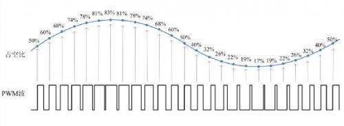 脈沖寬度調(diào)制(PWM)是一種對模擬信號進(jìn)行數(shù)字編碼的方法。通過高分辨率計(jì)數(shù)器的使用,方波的占空比被調(diào)制用來對一個具體模擬信號進(jìn)行編碼。PWM信號仍然是數(shù)字的,因?yàn)樵诮o定的任何時刻,滿幅值的直流供電要么完全有(ON),要么完全無(OFF)。電壓或電流是以一種通(ON)或斷(OFF)的重復(fù)脈沖序列被加到模擬負(fù)載上去。通的時候即是直流供電被加到負(fù)載上的時候,斷的時候即是供電被斷開的時候。只要帶寬足夠,任何模擬值都可以使用PWM進(jìn)行編碼。而占空比就是高電平持續(xù)時間與整個周期時間的比值,占空比越大,高電平持續(xù)的時間越長,模擬電路開通的時間就越長,如圖1所示。