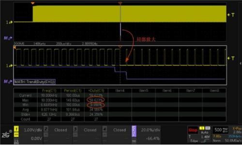 定位到占空比異常位置后,開啟示波器縮放模式下ZOOM多窗口顯示功能,對信號進(jìn)行局部放大,如圖6所示,可以清晰的看到占空比異常的細(xì)節(jié),同時開啟對ZOOM1窗口數(shù)據(jù)的測量和統(tǒng)計(jì),可以看到占空比從正常的59.62%變?yōu)?.99%左右。