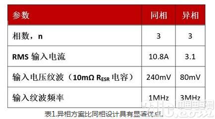 表1總結(jié)了三個(gè)同相工作轉(zhuǎn)換器和三個(gè)異相工作轉(zhuǎn)換器的性能結(jié)果對(duì)比。