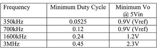 上面例子中的TPS54317型轉換器任務周期為0.36 (1.8V/5.0V),最小啟動時間為數(shù)據(jù)表中所示的150ns(最大值)??煽刂泼}寬的限制產生了可獲得的最小任務周期,根據(jù)等式3可以很容易算出來。一旦知道了最小任務周期,就可以計算出最低可獲取輸出電壓,如等式4和表格2中所示。最低輸出電壓也受到轉換器參考電壓限制,TPS54317的最低輸出電壓為0.9V。