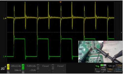 圖3 CH1使用夾子測量電源輸出,CH2使用夾子測量電感,單點(diǎn)接地