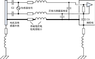4)此處電機(jī)平臺(tái)和測(cè)控柜已有接地,通過傳感器連接線屏蔽層又將兩者連接,形成地環(huán)路。然而實(shí)際工程應(yīng)用中地環(huán)路往往不可避免地存在,本例中若沒有屏蔽層依然會(huì)通過C2、電纜和C3產(chǎn)生高頻地環(huán)路,從這方面看屏蔽層改變了環(huán)路路徑。