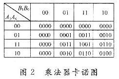 兩位乘法器能夠?qū)崿F(xiàn)2位二進(jìn)制數(shù)的乘法運(yùn)算,設(shè)A1A0,B1B0為乘數(shù)和被乘數(shù),P3P2P1P0為乘法運(yùn)算得到的積,由卡諾圖(見(jiàn)圖2)得到兩位乘法器的輸出邏輯函數(shù)表達(dá)式分別為: