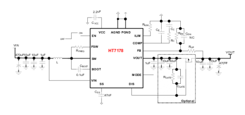①.HT7178的輸入電壓范圍是2.7V到15V, 輸出電壓范圍是4.5V到20V。該芯片集成了兩個低導(dǎo)通電阻的功率MOSFET:一個11m?6?8開關(guān)FET和一個13m?6?8整流器FET,使用具有集成斜坡補償功能的固定頻率峰值電流模式控制。HT7178 PFM,PWM兩種模式可選,匹配不同的應(yīng)用場合,提高效率。