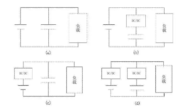 與超級電容配合使用的DCDC,在整車電源中的位置如下圖所示,它可能出現(xiàn)在圖(b)、(c)、(d)中所示位置上,而(b)是應(yīng)用較多的一種形式。