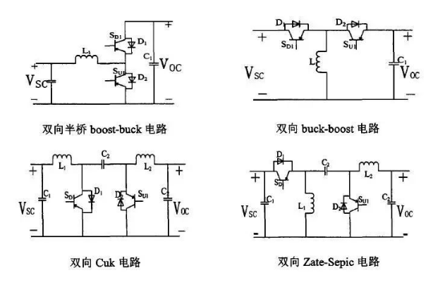 非隔離雙向DCDC,結(jié)構(gòu)比較簡單,每個部件都是直接相連,沒有額外的能量損失,工作效率比較髙。對升壓側(cè)的電容要求比較高。主要的非隔離DCDC電路結(jié)構(gòu)有雙向半橋boost-buck電路,雙向buck-boost電路,雙向buck電路,雙向Zate-Sepic電路,如下圖所示。