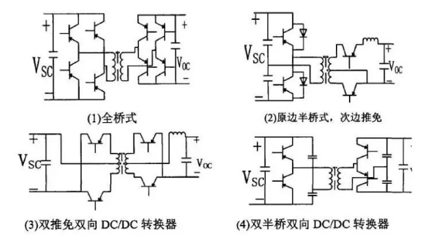 隔離型雙向DCDC,在非隔離型雙向DCDC轉(zhuǎn)換器的基礎(chǔ)上加上一個高頻變壓器就構(gòu)成了隔離型雙向DCDC轉(zhuǎn)換器,高頻變壓器兩側(cè)的電路拓?fù)淇梢允侨珮蚴?、半橋式、推挽式等等。這幾種隔離型的雙向DCDC轉(zhuǎn)換器,采用了更多的功率開關(guān),電壓變比大,帶電氣隔離等優(yōu)點。但是這類DCDC轉(zhuǎn)換器結(jié)構(gòu)復(fù)雜,成本也相對較高,轉(zhuǎn)換器的損耗高,低頻時會導(dǎo)致隔離變壓器鐵芯飽和,損耗會進(jìn)一步增加。因此,非隔離型雙向DCDC轉(zhuǎn)換器比隔離型在電動汽車上運用更具有優(yōu)勢。