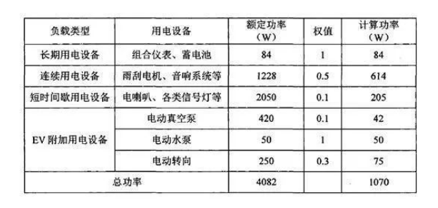 根據(jù)純電動汽車車載電子設(shè)備的不同屬性,能把用電設(shè)備分為長期用電、連續(xù)用電、短時間間歇用電和附加用電設(shè)備種類型,并賦于不同的權(quán)值。其中,長期用電設(shè)備包括組合儀表和蓄電池,權(quán)值取1;連續(xù)用電設(shè)備包括雨刮、電機(jī)、音響系統(tǒng)和儀表照明等設(shè)備,權(quán)值可取0.5;短時間間歇用電設(shè)備包括電喇機(jī)、各類信號燈、控制器等設(shè)備,權(quán)值可取0.1;附加用電設(shè)備電動真空泵、電動水泵和電動轉(zhuǎn)向,權(quán)值根據(jù)實際情況分別取0.1、1、0.3。各類設(shè)備所消耗功率分析如表所示。