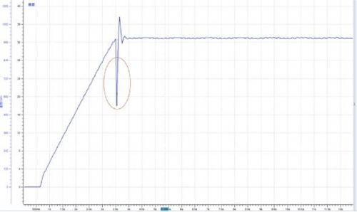 某使用PWM波形驅(qū)動的直流電機(jī)在加速過程中存在微小抖動情況,觀察電機(jī)轉(zhuǎn)速波形如圖3所示,開始加速后大約在3.6秒轉(zhuǎn)速出現(xiàn)一個下拉動作。電機(jī)PWM調(diào)速原理是通過改變接通脈沖的寬度,使直流電機(jī)電樞上電壓的占空比改變,從而改變電樞電壓的平均值,控制電機(jī)的轉(zhuǎn)速。因此基本可以確定這個轉(zhuǎn)速下拉動作是由于PWM波占空比出現(xiàn)異常引起的。