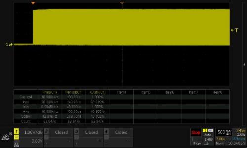 示波器的存儲深度對占空比趨勢測量影響很大,所謂趨勢趨勢,即是長時間的變化動向,如果存儲深度小,那么所記錄的時間就很短,采樣的波形也就很少,對于分析趨勢就沒有意義。目前ZDS4000系列示波器存儲深度高達(dá)512Mpts,可以在高采樣率下存儲數(shù)十秒的波形,比較適合分析信號變化趨勢。