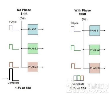 圖2:同相和異相配置三相DC轉(zhuǎn)換器對(duì)比。