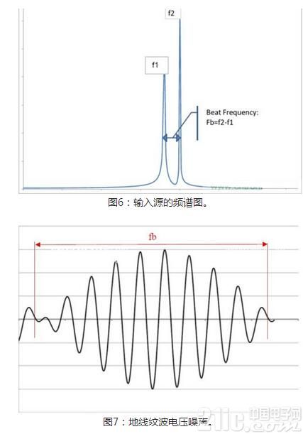 如上文所述,ISL8018可從主轉(zhuǎn)換器或外部時(shí)鐘加以同步。該特性在多個(gè)穩(wěn)壓器的工作頻率彼此很接近時(shí)是必不可少的。圖6顯示了工作頻率分別為f1和f2的轉(zhuǎn)換器1和2。輸入可見(jiàn)一個(gè)“拍”頻(fb),亦即f1與f2之差。如果沒(méi)有隔離的話,該fb將在GROUND出現(xiàn)。輸出則可能如圖7所示,其中的包絡(luò)即為“拍”頻。