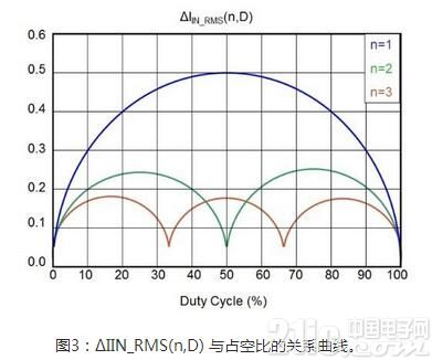 其中,n為相數(shù),L為輸出電感,F(xiàn)s為開(kāi)關(guān)頻率,k(n,D)=floor(n,D),floor函數(shù)的返回值為小于或等于輸入值的最大整數(shù)。圖3顯示了ΔIIN_RMS(n,D) 與占空比的關(guān)系曲線。