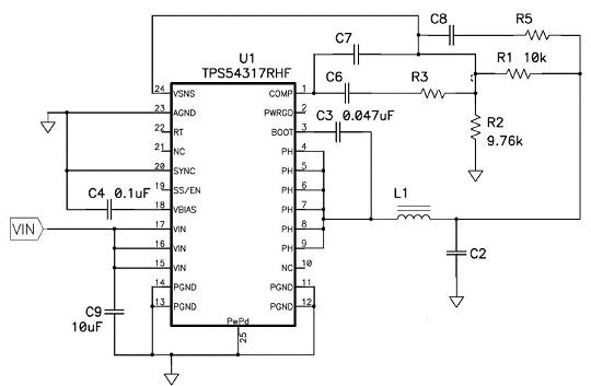 最低輸出電壓=輸入電壓x 最小任務周期(受TPS54317參考電壓限制)