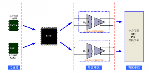 如圖 3所示,MCU處理數(shù)字溫度、濕度傳感器的信號,處理完畢后,通過信號調(diào)理模塊隔離,再傳送出去,以便跟現(xiàn)場的電流輸入,或電壓輸入型電力儀表相連,同時具備隔離的功能,防止傳感器前端的干擾信號串入現(xiàn)場的電力儀表、PLC,DCS等。