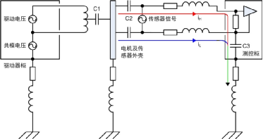 4)此處電機(jī)平臺(tái)和測(cè)控柜已有接地,通過傳感器連接線屏蔽層又將兩者連接,形成地環(huán)路。然而實(shí)際工程應(yīng)用中地環(huán)路往往不可避免地存在,本例中若沒有屏蔽層依然會(huì)通過C2、電纜和C3產(chǎn)生高頻地環(huán)路,從這方面看屏蔽層改變了環(huán)路路徑。