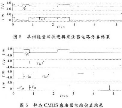 從圖中可見(jiàn),用靜態(tài)CMOS電路構(gòu)成的乘法器輸出比較穩(wěn)定,輸出等于0或VDD,功率消耗為1.51×10-7W。而用單相能量回收電路構(gòu)成的二位乘法器的輸出不夠穩(wěn)定,對(duì)噪聲信號(hào)較為敏感,但是并不影響輸出邏輯,功率消耗減小為1.17×10-7W。從節(jié)能的角度來(lái)看,單相能量回收電路性能更好。